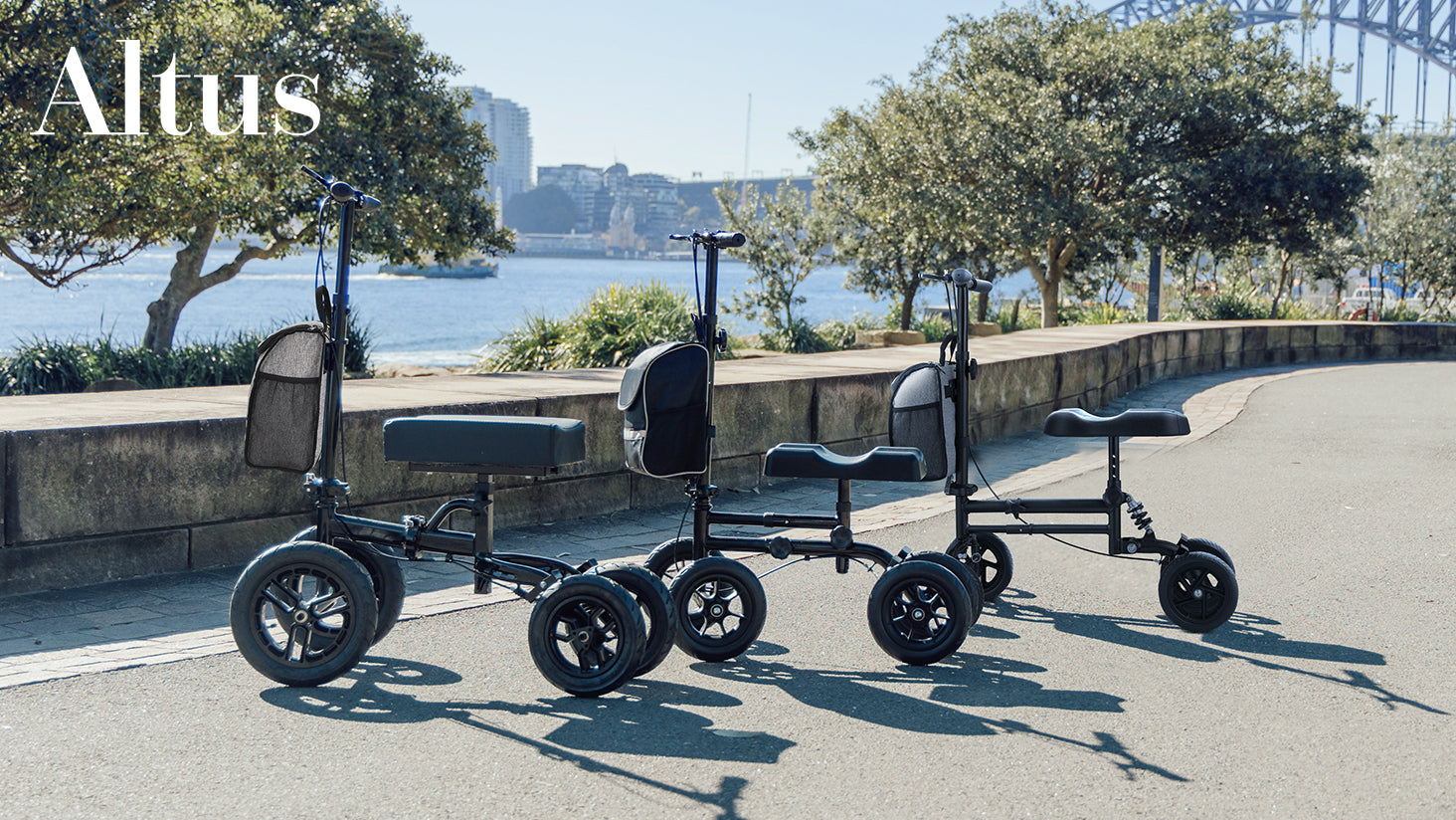 Note: Please consult your healthcare professional to confirm suitability before use. The Altus Knee Scooter range is available in 8", 10", and 12" wheel models, tailored to accommodate different terrains, user heights, and weight requirements.