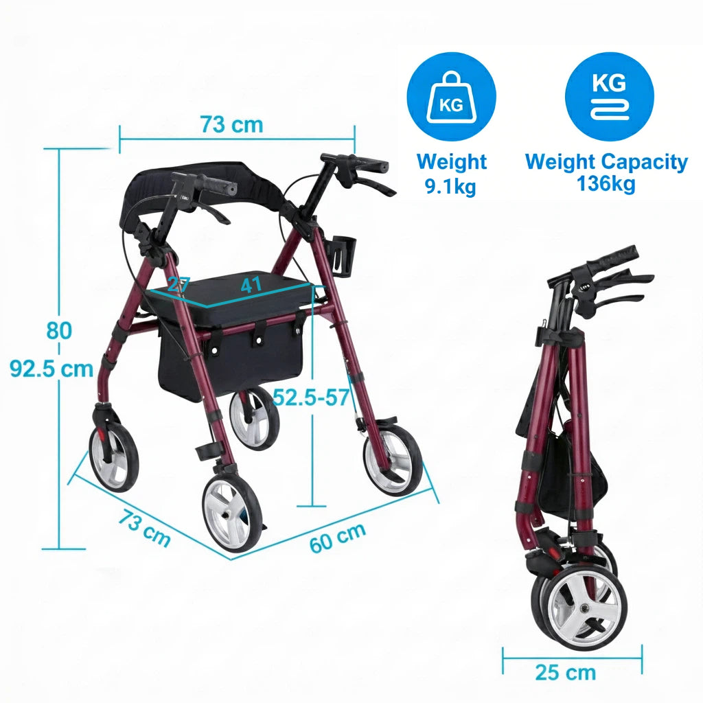 Altus Heavy Duty Classic 4 Wheel Foldable Rollator with Seat - Cherry Red