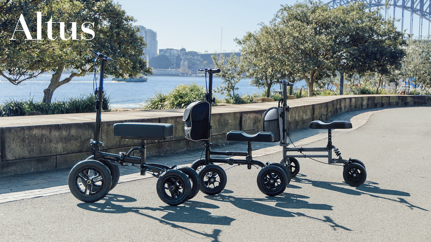 Note: Please consult your healthcare professional to confirm suitability before use. The Altus Knee Scooter range is available in 8", 10", and 12" wheel models, tailored to accommodate different terrains, user heights, and weight requirements.