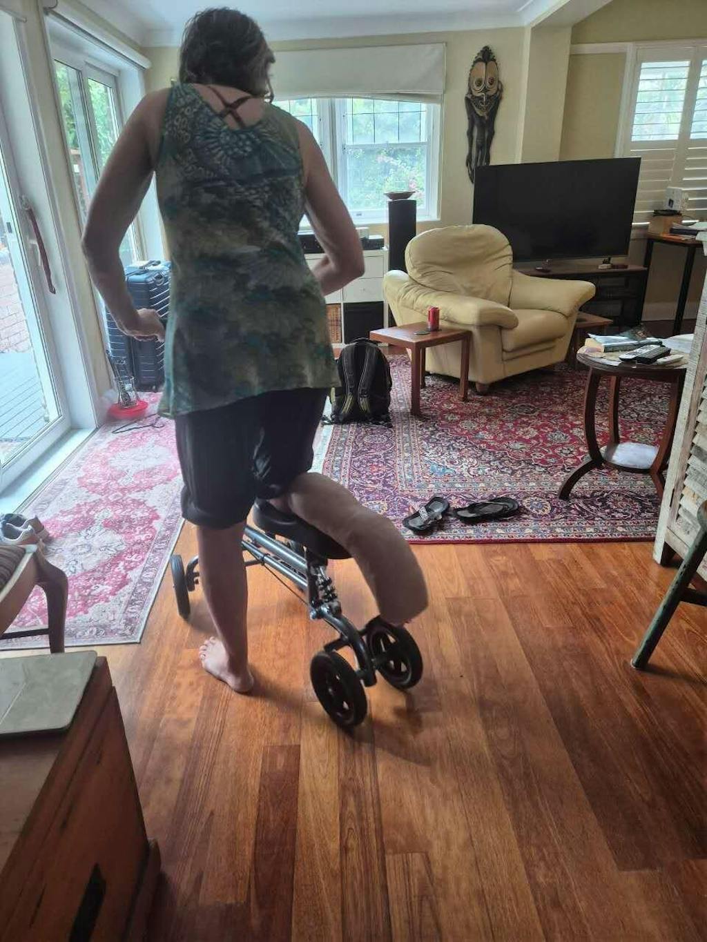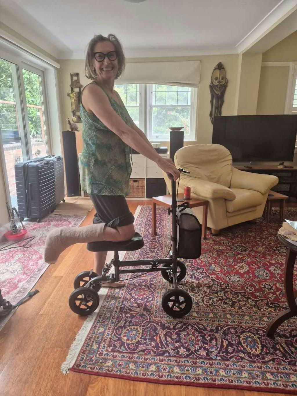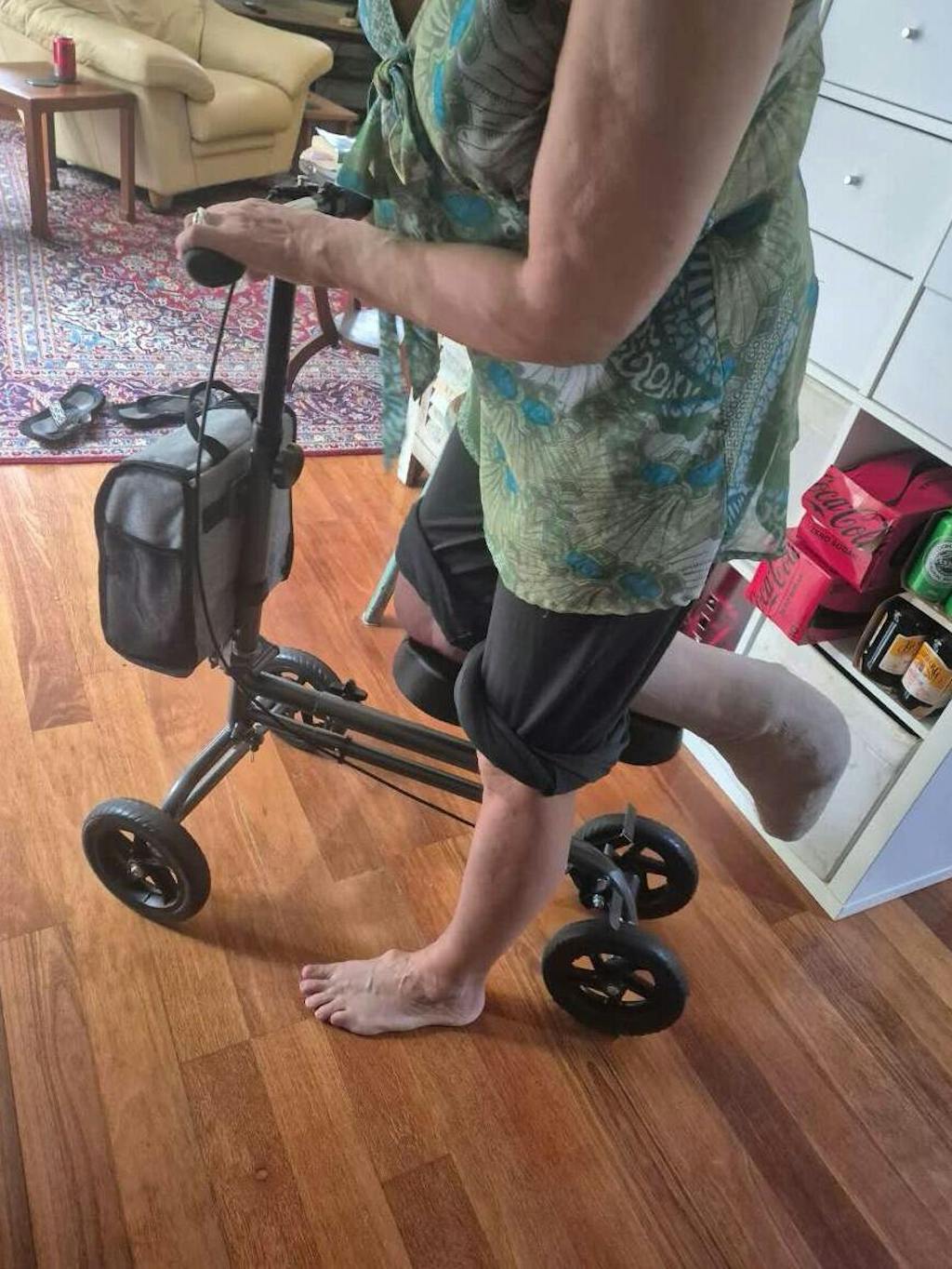 I broke my foot and was stuck on crutches for weeks, which was exhausting. This knee scooter changed everything! It's very sturdy, moves smoothly on my carpets, and the basket is super handy for carrying things around the house. Much better than crutches. Highly recommend to anyone in a cast!